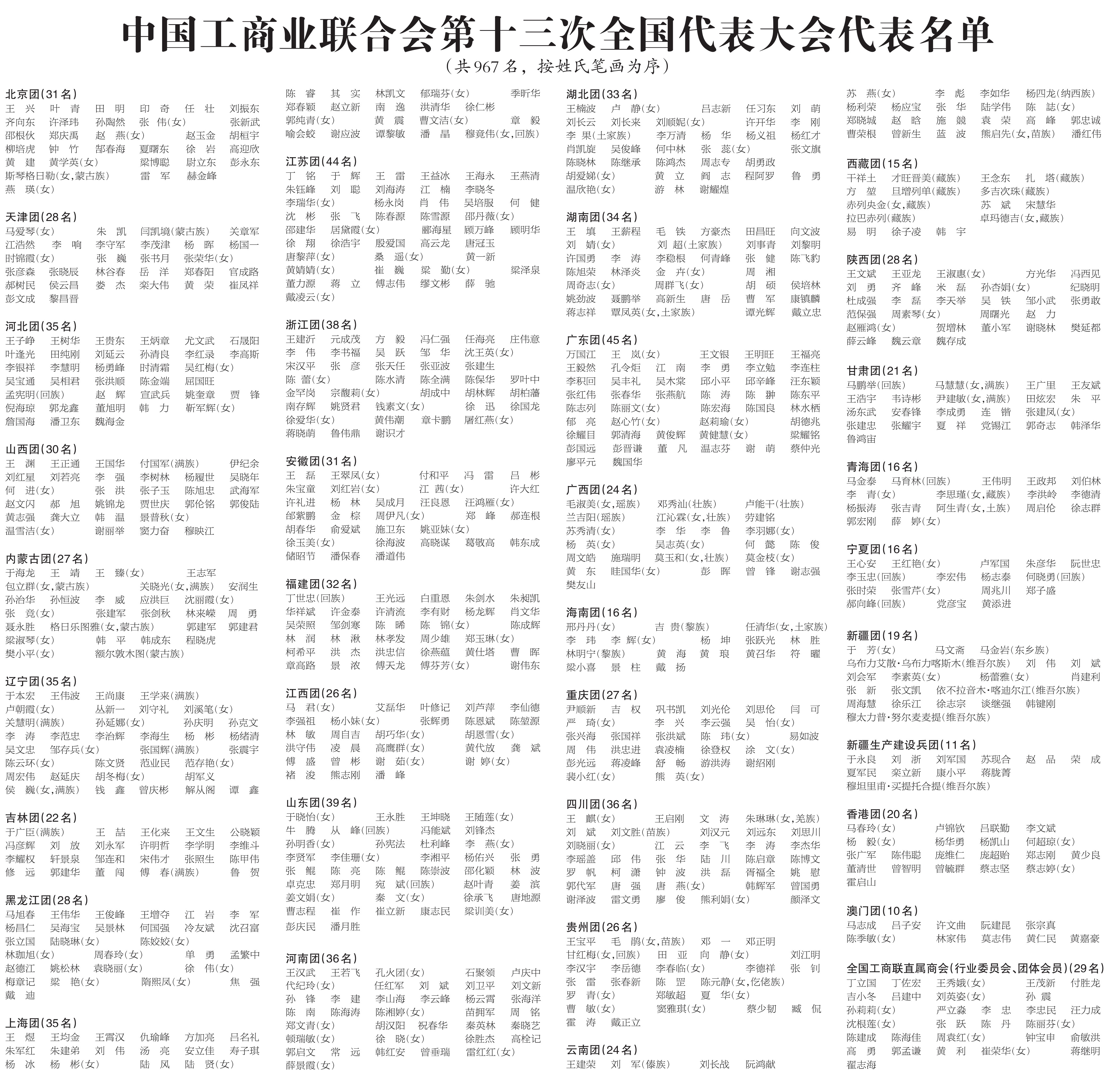 中國(guó)工商業(yè)聯(lián)合會(huì)第十三次全國(guó)代表大會(huì)代表名單
